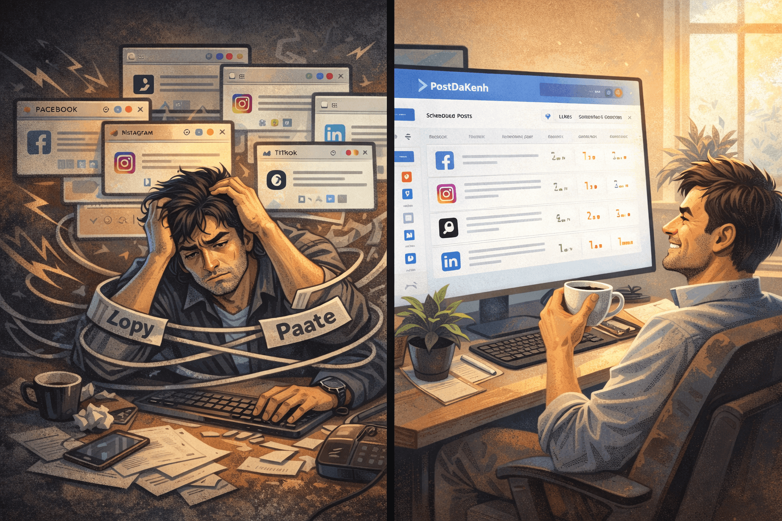Bạn mở tab Facebook, rồi đến Instagram, tiếp theo là TikTok, không quên lướt qua LinkedIn và kết thúc ở Zalo. Với mỗi nền tảng, bạn lại phải: copy-paste caption, chỉnh lại kích thước ảnh cho đúng chuẩn, gắn hashtag thủ công, và lặp đi lặp lại việc nhấn nút "Đăng".